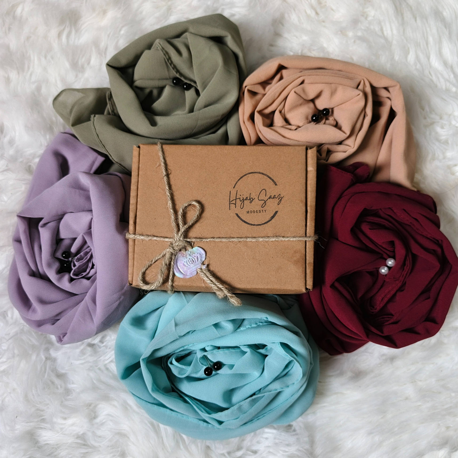 🎁 What You Get in This Box:✔ 5 Premium Georgette Hijabs✔ FREE Hijab Cap (Worth Rs 200)✔ FREE Pin Wheel✔ FREE Bulb Pins Pack✔ FREE Hijab Tape✔ FREE Turkish Pin